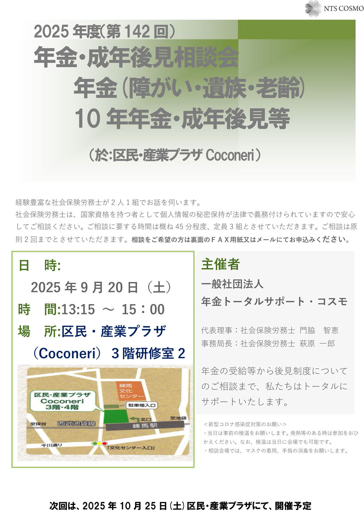 年金のプロフェッショナル集団である一般社団法人年金トータルサポート・コスモの一員として、年金等無料相談会を担当しています。