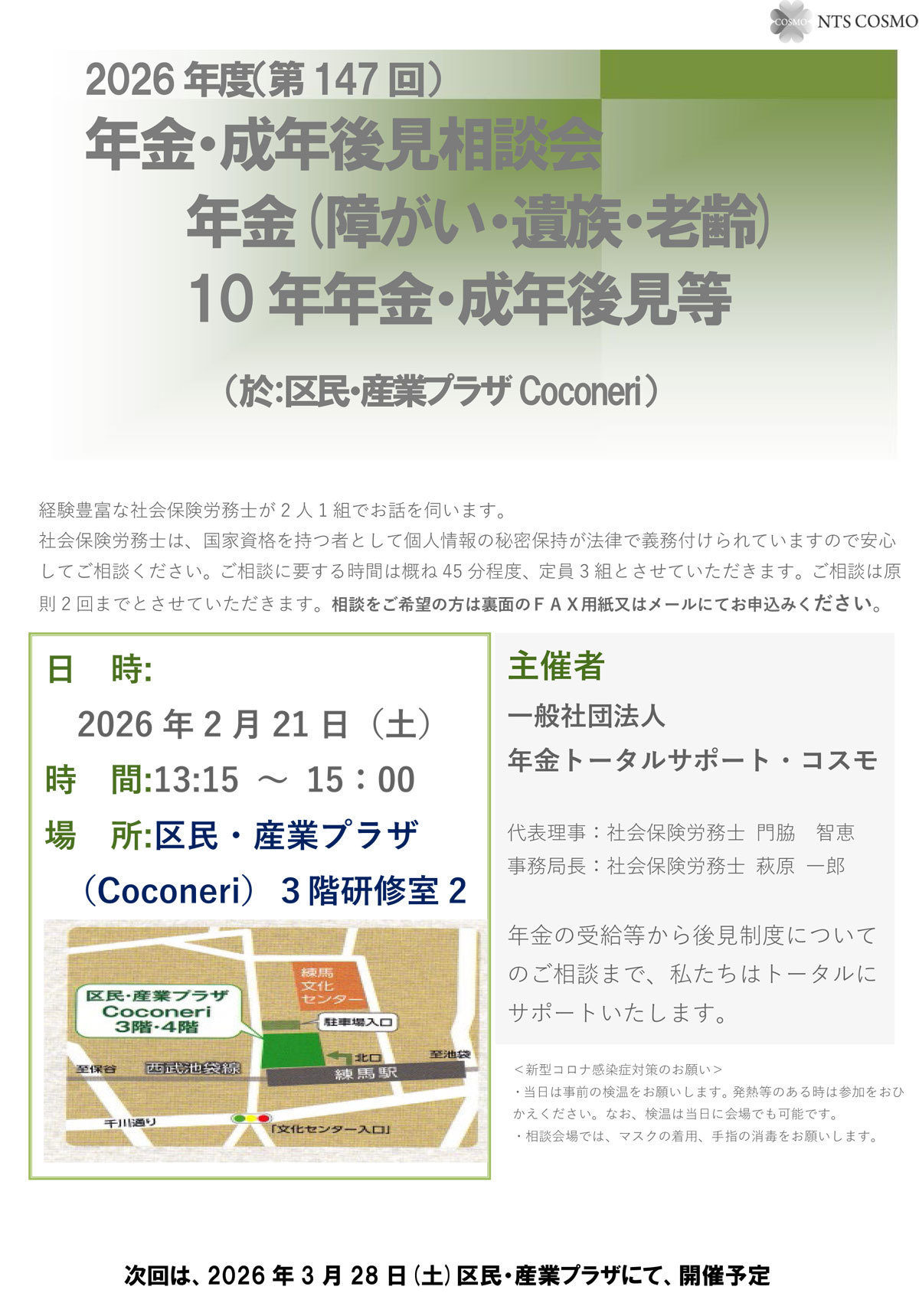 年金のプロフェッショナル集団である一般社団法人年金トータルサポート・コスモの一員として、年金等無料相談会を担当しています。